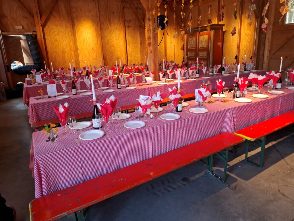 La grange viticole habituellement réservée au matériel et aux véhicules avait été joliment décorée et offrait un décor chaleureux.